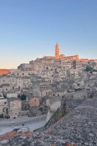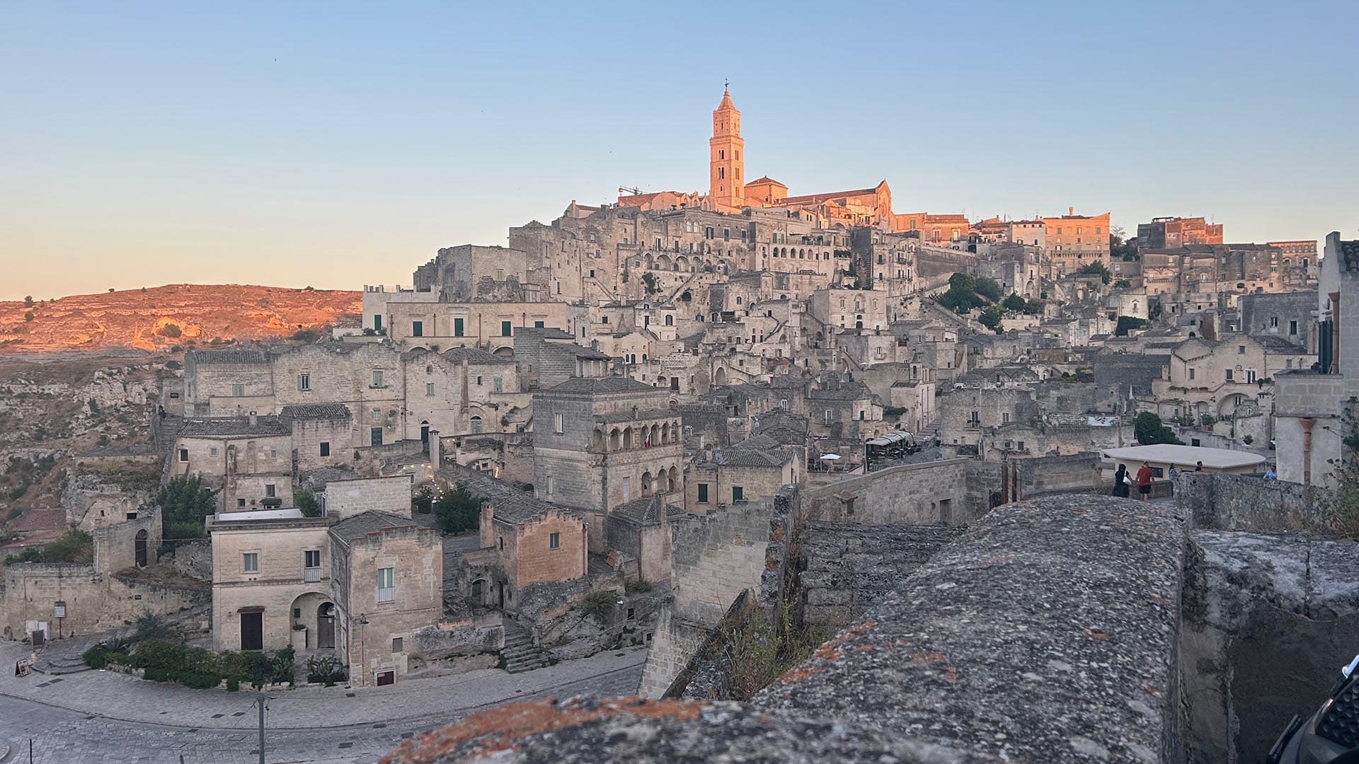 - Matera at dusk, the city glowing in amber light as we sipped wine on a stone terrace.