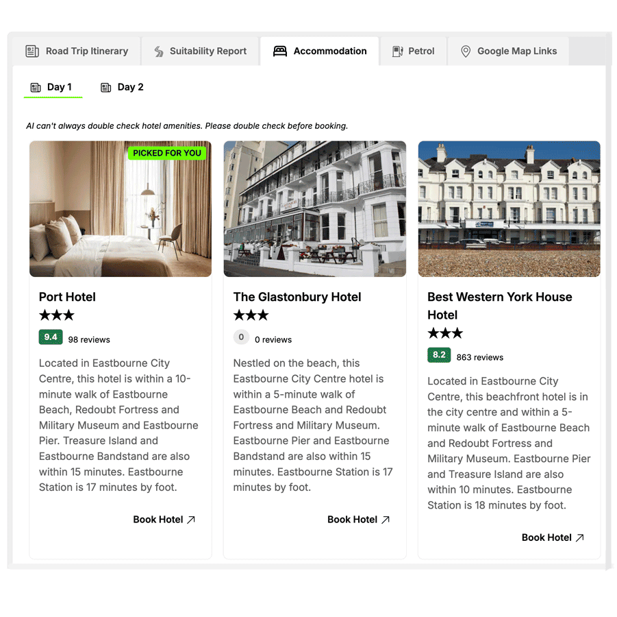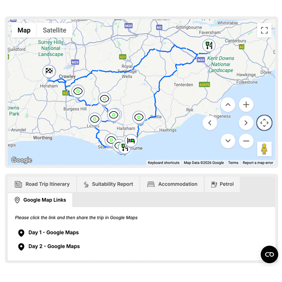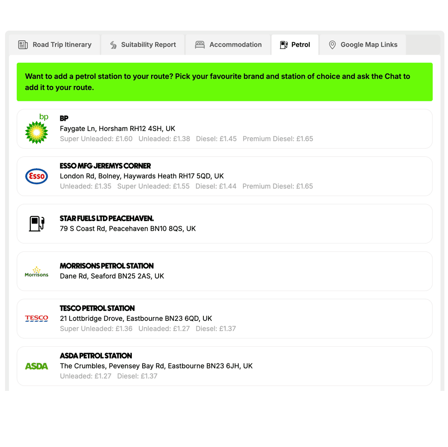 No one wants to be caught hunting for fuel mid-journey. Every road trip created in our Free AI Trip Planner includes reliable petrol station suggestions, shown clearly in your trip overview. We’ll show you fuel type, brand, and where possible, today’s prices – just let the chat know which one to add. From quick blasts to long hauls, your fuel planning is already done. Simple, reassuring, and part of the free plan.