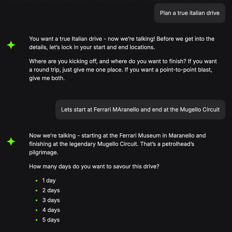 Forget dropdowns and forms. The Free AI Trip Planner from New Roads lets you build road trips just by having a conversation. Designed to feel like chatting with a mate who knows every back road, our AI understands your car, your time, and your vibe – whether that’s a lazy drive with pub lunches or a highland blast with hairpins. With your free account, you can create up to three road trips using up to 25 chat prompts per trip. Planning feels effortless, and every conversation helps our AI get smarter. Upgrade to a full subscription to unlock unlimited chats, unlimited journeys, and the full power of New Roads.