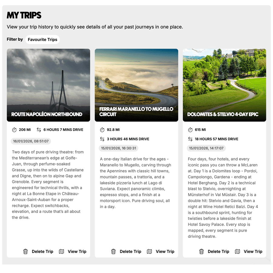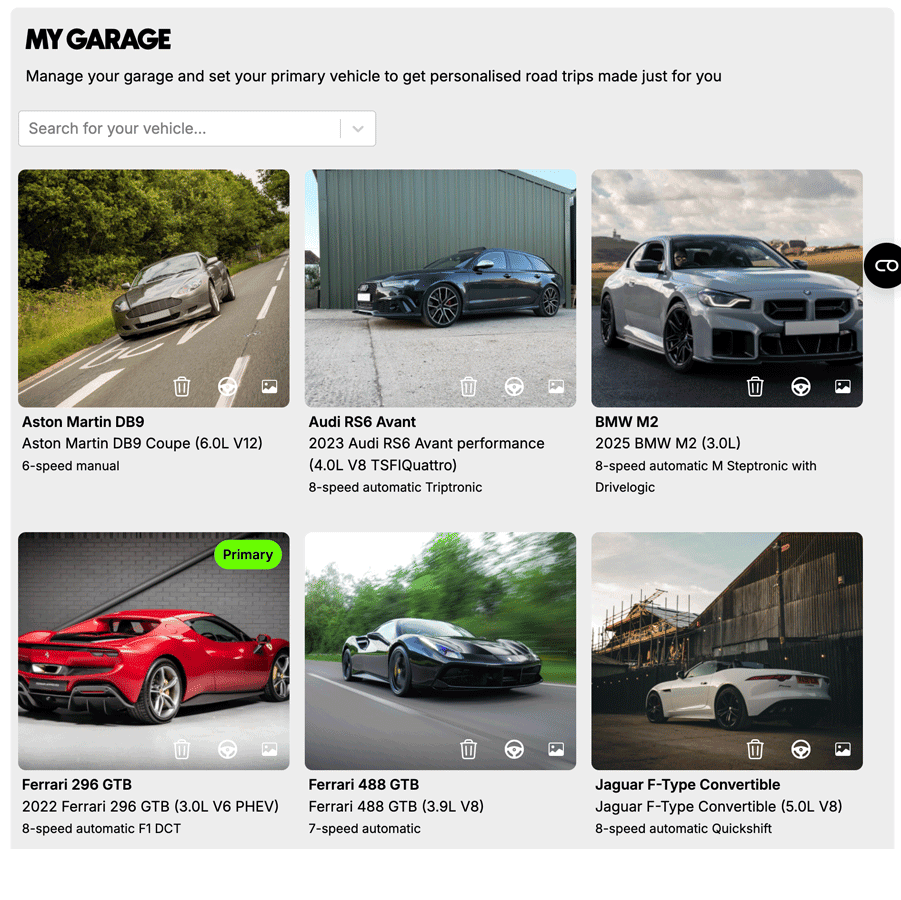 Your Free AI Trip Planner includes access to the digital garage, where you can add and manage your vehicles. The AI uses this data to tailor each route to your car’s size and character. Whether you’re switching from hot hatch to hybrid, or Sunday toy to daily wagon, the app adapts to match. This essential feature comes with every account – free or paid – but with the subscription, you can build unlimited journeys around every car in your collection.