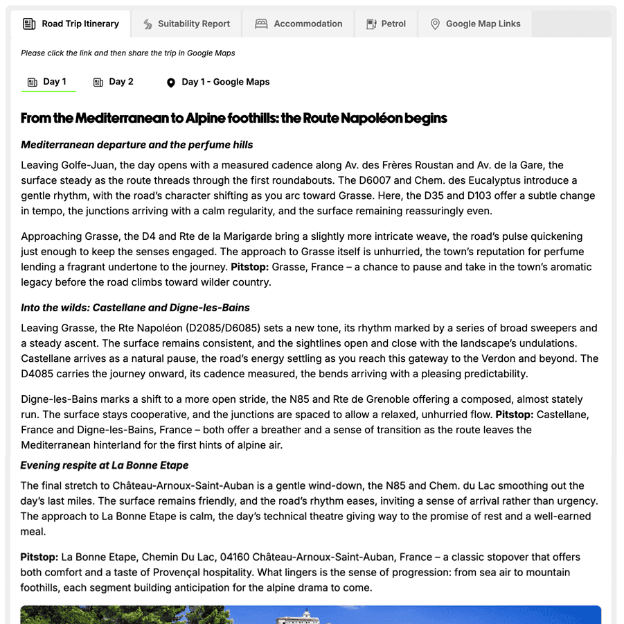 Google Maps integration is available with the subscription tier. While the Free AI Trip Planner lets you view, edit and review your route in full within the app, route export to Google Maps is unlocked when you subscribe. See the road ahead in Street View, check traffic, or send your drive to your car nav system with a single click – available once you go beyond the free experience.