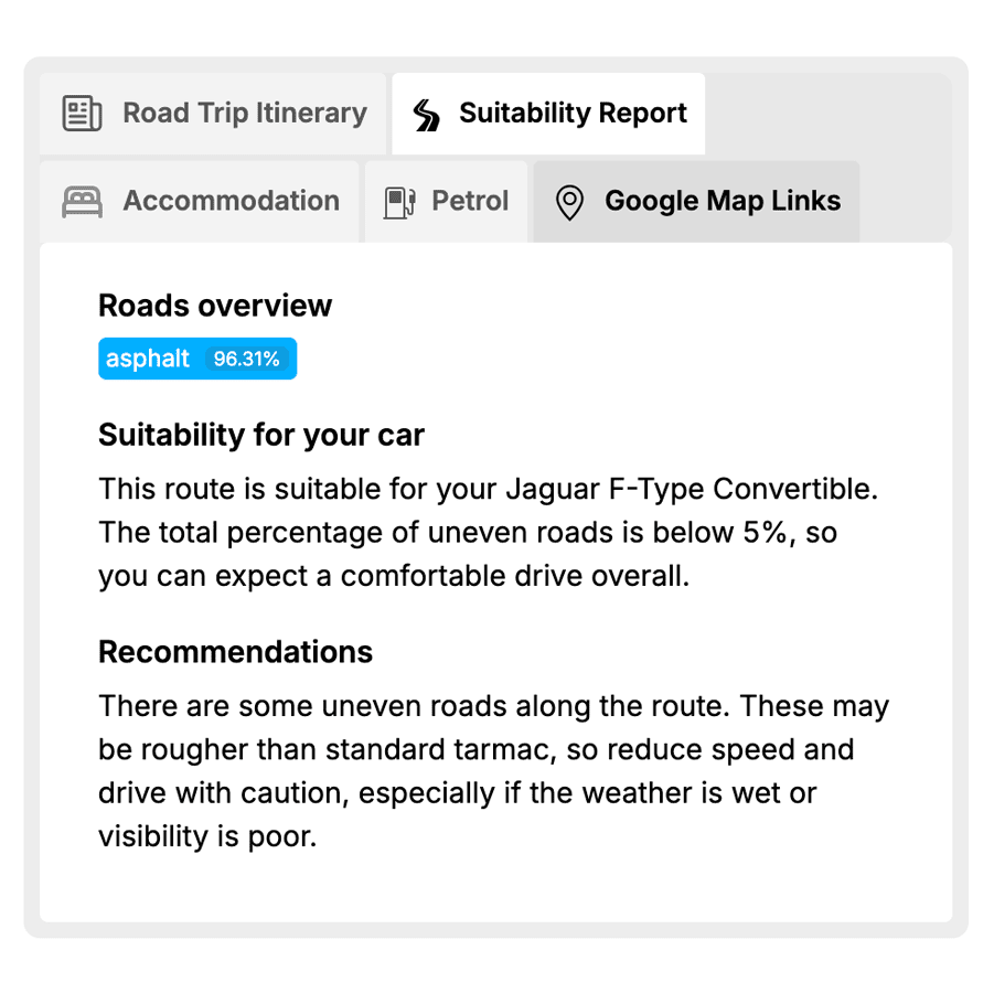 With your free account, each trip comes with a Vehicle Suitability Report – because not every road suits every car. Our Free AI Trip Planner analyses your selected vehicle’s profile against the planned route, flagging any issues with width, incline or surface type. Whether you’re in a wide estate or a lowered coupe, you’ll get an upfront view of what to expect – and if something doesn’t feel right, you can ask the chat to rework the route. Confidence comes as standard, even on a free plan.