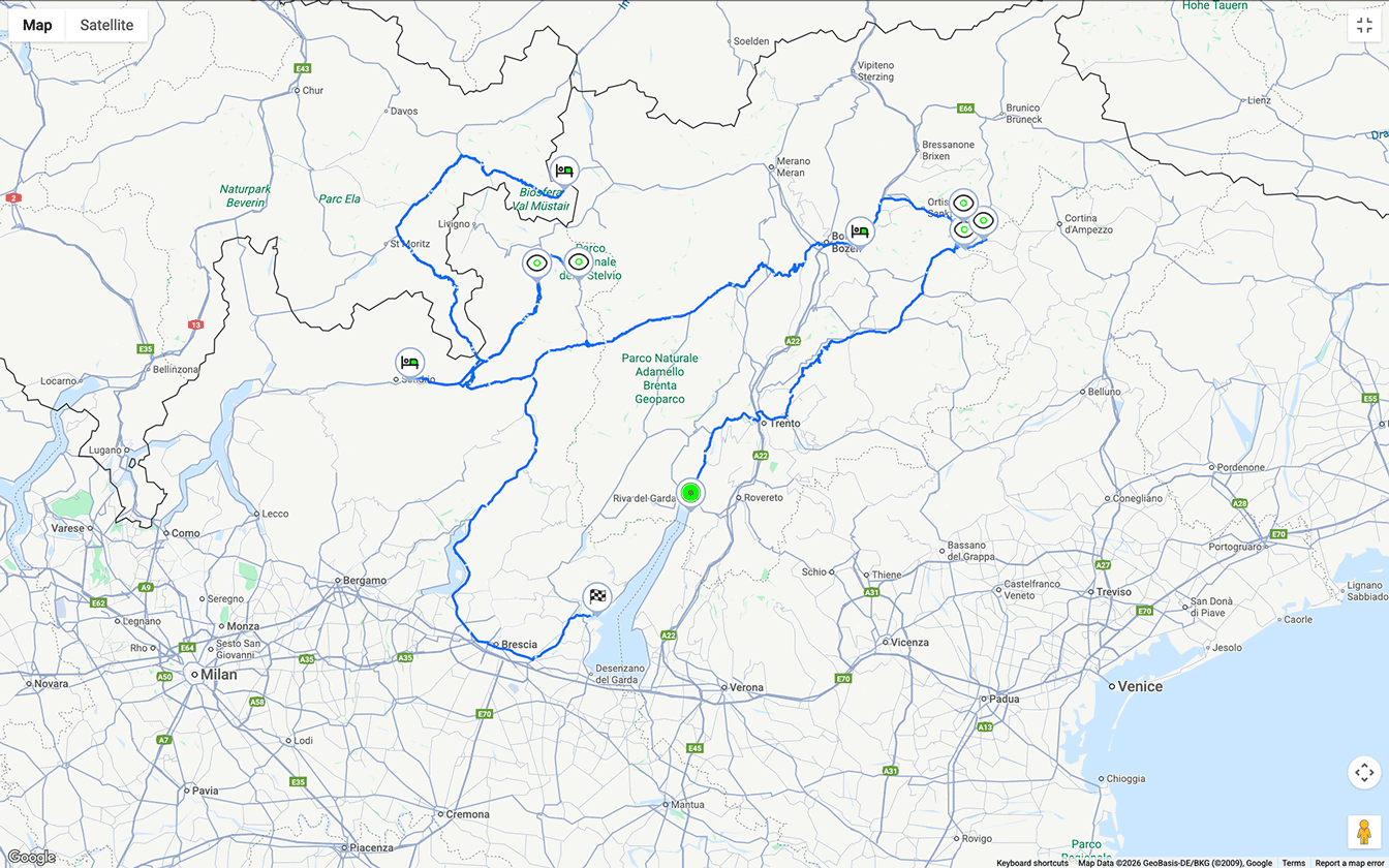 Note: This route has seasonal restrictions. Mainly the Stelvio and Gavia Passes. If you view the route during the restricted months the map will only take you so far and then turn you back to ensure you don’t end up on the slopes. Once they are open the route will update.