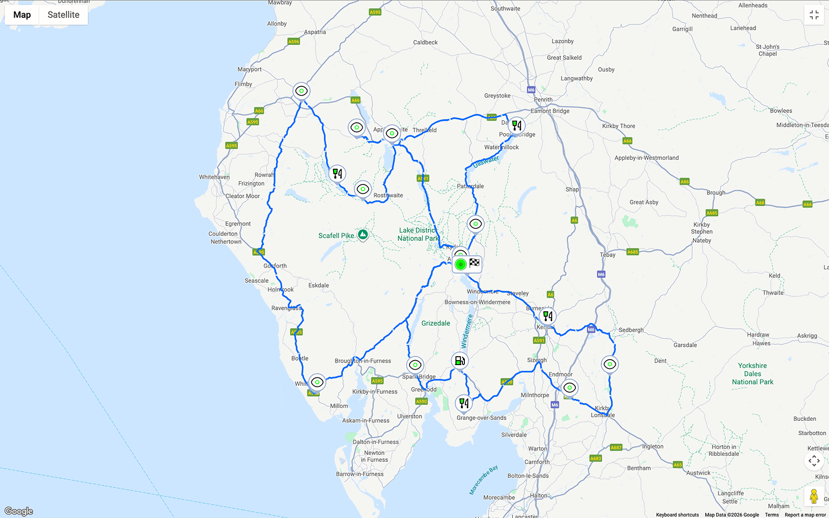Note: At the time of planning this trip the southern most point of the Kirkstone pass and the Eastern approach to the Honister Pass were closed due to a land slip. This route doesn’t drive those parts of the road but once it’s re-opened, we’ll update the drive to include them.