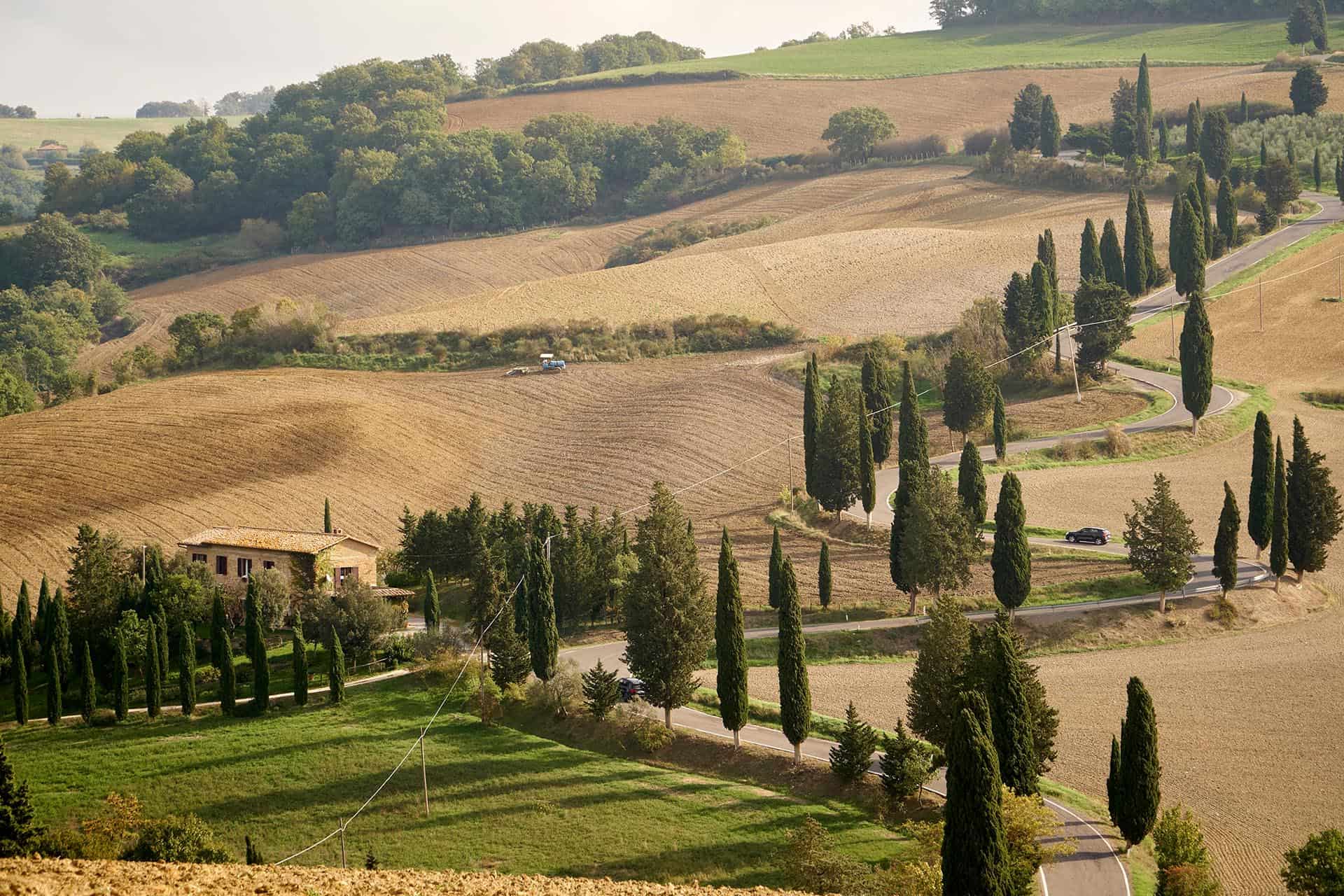 From there, the SP40 and SP62 lead toward the Tuscan border, gradually widening, softening, and opening into the more generous sweepers around Barberino di Mugello. The landscape becomes broader, but the road never loses its sense of connection. Final approach via the SS65 della Futa and SP503 that descends into one of motorsport’s sacred grounds.