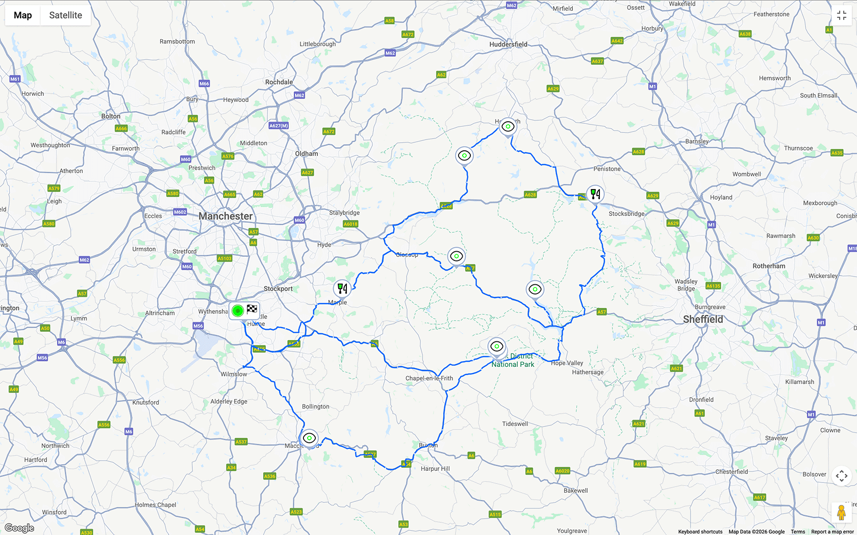 This two-day road trip through the Peak District is a celebration of contrast, from summit climbs to limestone gorges, sweeping moorland roads to narrow, hedge-lined lanes. Beginning from the calm edges of suburban Manchester, the drive quickly trades city pace for the open pulse of the A523 and A6, gently rolling toward the gritstone ridges ahead.