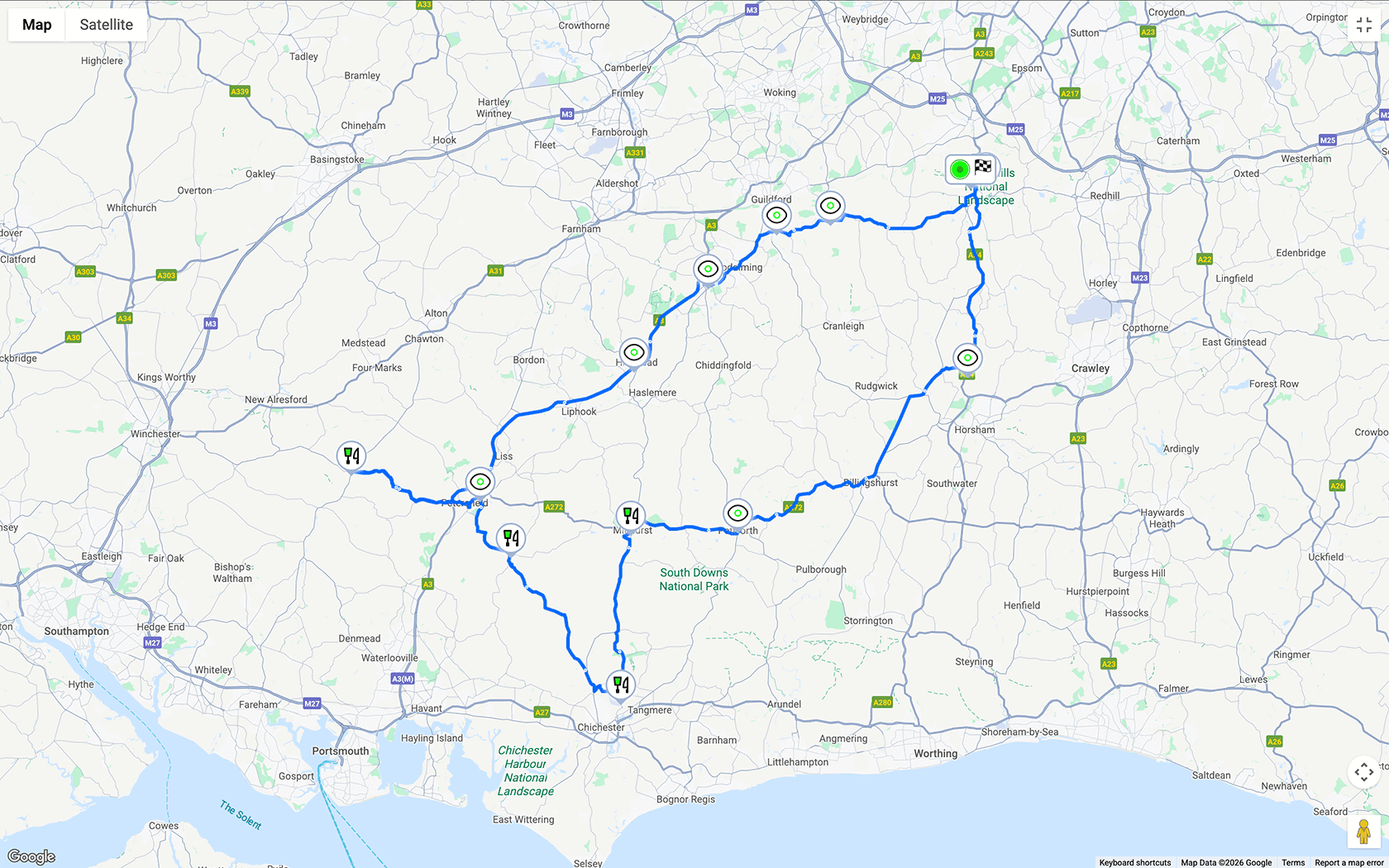 The run to Caffeine & Machine via the A272 and A32 opens things up again before a smooth return through the Hindhead Tunnel, where progress is quiet, fast, and flowing. The final pass through The Albury Estate, past Shere (where The Holiday was filmed) and along the valley of the North Downs as it weaves its way to the last stop.
